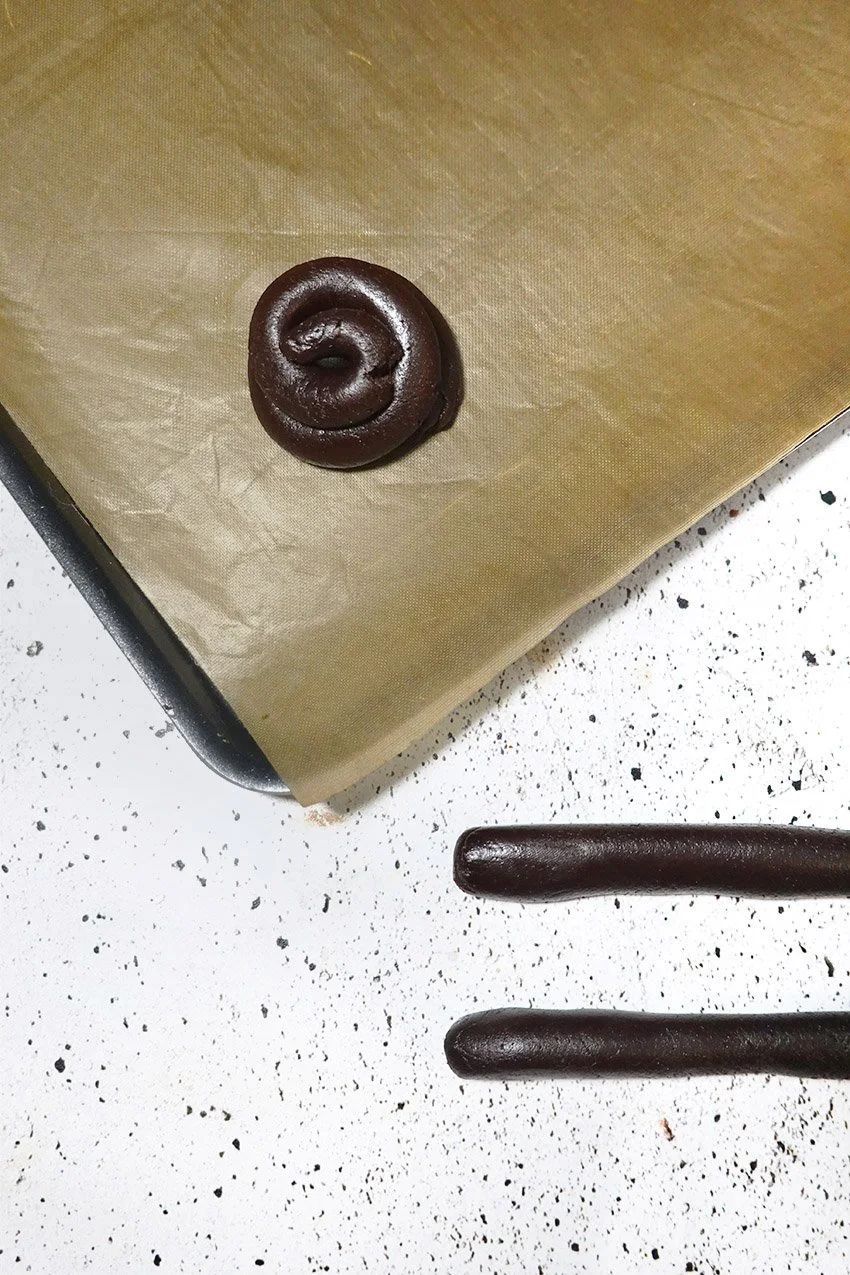 Divisez un premier huitième en 5. Un par un, roulez délicatement du bout des doigts chaque morceau sur le plan de travail. Pendant que la pâte est encore bien molle, enroulez le boudin en petit tas sur une plaque recouverte de papier sulfurisé - la pâte durcit vite donc c’est beaucoup plus pratique de les faire un par un -